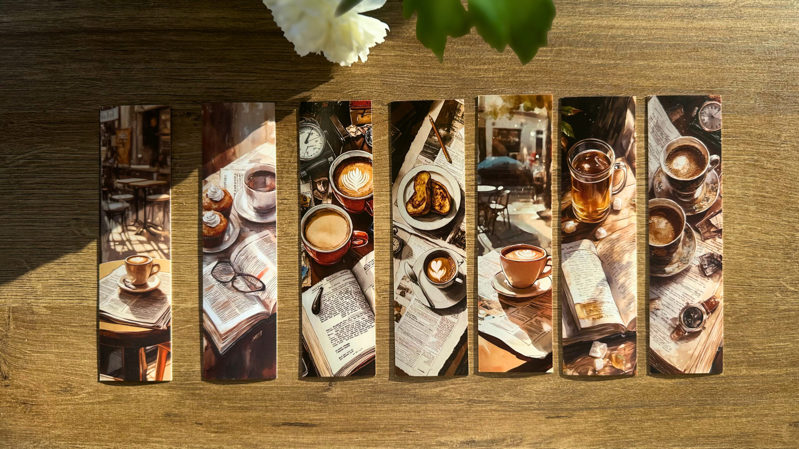 La collection se compose de 7 marque-pages différents, chacun illustré autour de l’univers du café, des livres et des instants cosy. Des tons chauds, une atmosphère feutrée, parfaite pour accompagner vos lectures du quotidien.